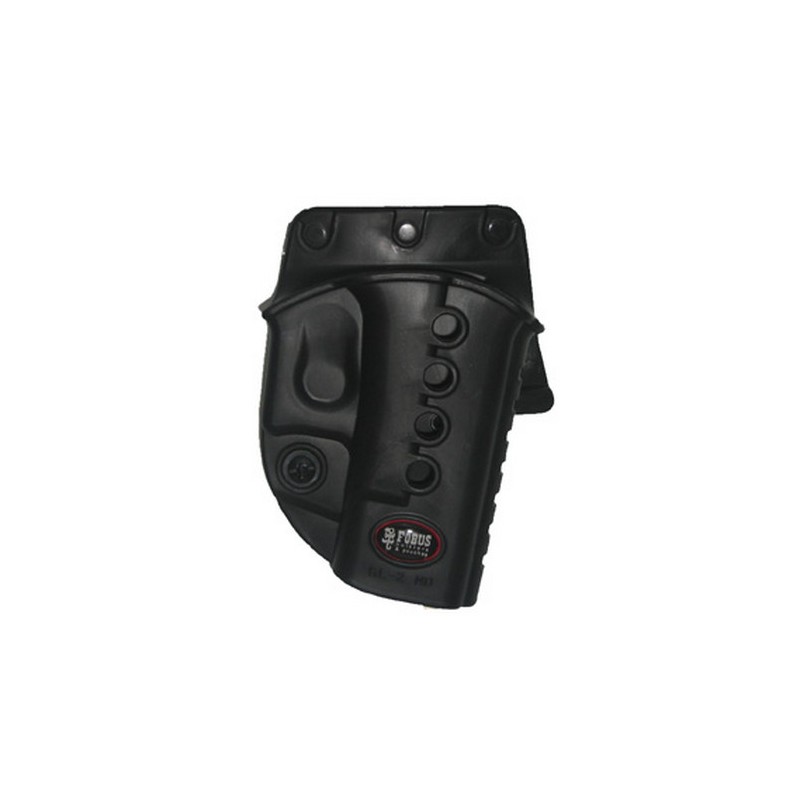 The E2 series features one-piece holster body construction, and like all FOBUS Holsters, the E2, is lightweight and includes steel reinforced rivet attachment and a protective sight channel. A tension adjustment screw is incorporated to allow the user to customize the ease of presentation and the security of retention.The paddle also includes a rubberized insert to provide both comfort and stability.