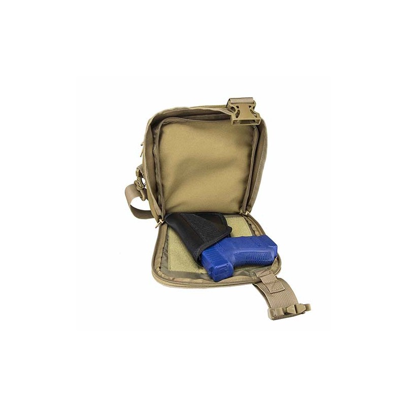 - Hidden dual zippered CCW compartment that is secured with a quick connect plastic buckle. Unlatched the buckle and pull the buckle and shoulder strap apart to automatically to reveal and expose the hidden CCW compartment and holster.