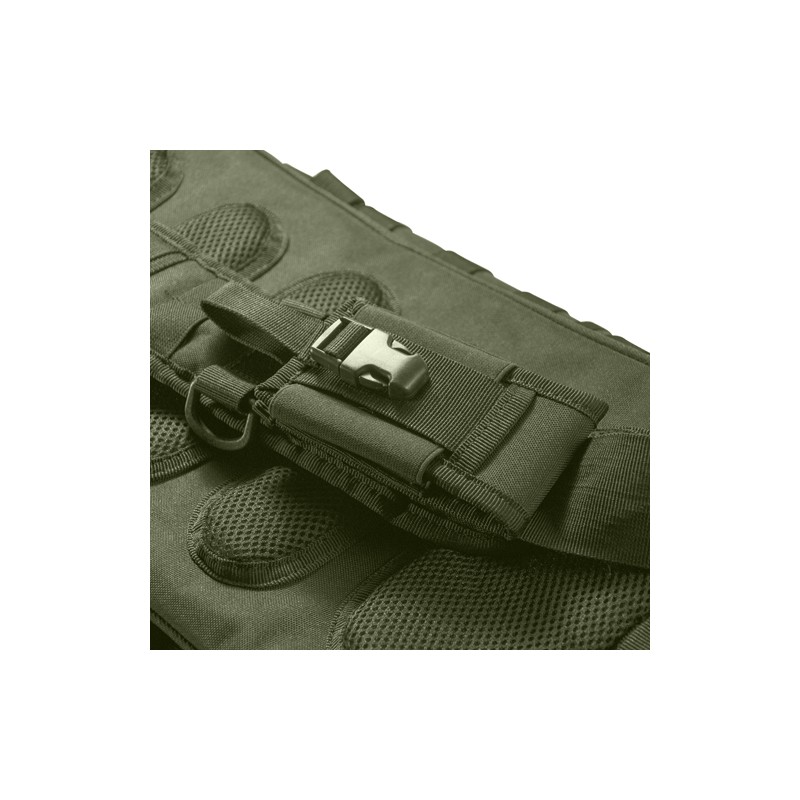 One main compartment and 2 smaller compartments with internal organizer. Ambidextrous cross-body padded shoulder sling strap system. Front and Side 1" web system for attaching extra accessories. Top and bottom handles offer alternative carrying positions. Padded back with ventilation channels. Large Hoop and loop fastener area for attaching patches or name tapes. Top access pass through port. Side compression straps, adjustable hoop and loop fastener dividers. Dual Mag Pouch not included.