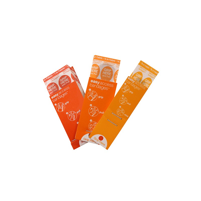 One handed application is as easy as 1-2-3! Just grip, pull, and stick! Easy Access Bandages are secured in portable packs that slip into a pocket or purse for easy transport without damaging the bandages. The packs are also organized by size so it is easy to find the size you need when you need it. Easy to apply with less mess and no loose tabs, the one handed application also minimizes contamination risk. Sterile and latex free. Assorted contains packs of 10 each - Large 1 in x 3 in, Medium 3/4 in x 3 in, and Junior 3/8 in x 1 5/8 in.