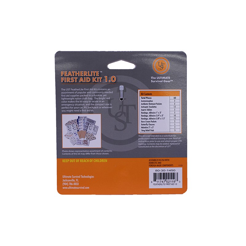 The FeatherLite First Aid Kit 1.0 contains an assortment of first aid supplies needed to treat a variety of minor injuries. The outer case is constructed of durable, lightweight nylon cloth that is bright red to make it easy to locate. A detailed First Aid Kit Owners Guide is also included with basic first aid instructions.
