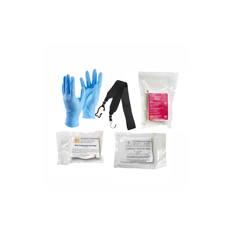H&H Medical brings its expertise in creating complete trauma kits to the law enforcement community with their line of pre-packed trauma response kits. H&H Medical pre-made response kits package is their most popular products in small, vacuum sealed packs that is secured in NcStar's small utility pouch. H&H Medical's smallest kit is the Patrol Officer Casualty Kit for Emergency Trauma. The Pocket puts everything an officer needs to immediately respond to a major trauma in a package designed to fit in small spaces (4.5" x 4.5" x 2") and weighs less than a pound. The Pocket Kit is secured in NcSTAR's Small Utility Pouch that is MOLLE/PALS compatible. The Trauma Kit can be attached to any MOLLE/PALS compatible gear.
