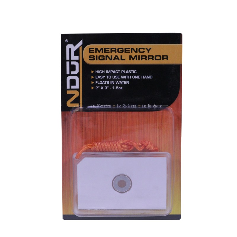The NDuR Emegency Signal Mirror is made of robust high impact plastic. Easy to use with one hand. Suns reflection can be seen for many miles. Floats if accidentally dropped in water. Measures 3" x 2". Ideal for Survival Kits.