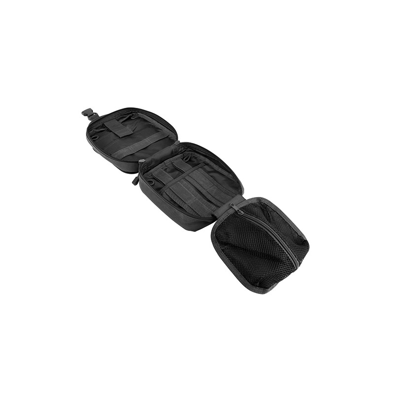 - This MOLLE EMT Pouch has a double zippered main compartment that is a tri-fold design that unfolds into three separate compartments for easy access to your supplies. The flip-out panel has a zippered compartment with see-through mesh material to easily identify the supplies stored in that compartment. The other two panels have several pockets and a dozen elastic straps to organize your supplies.
