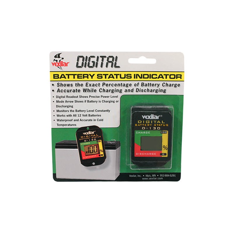 A unique battery fuel gauge that recognizes both the discharge and charge cycle of your battery. It will sense the current charging condition of the battery, display the percentage of remaining capacity and display a charge trend arrow. The D-130 will continue to measure capacity and trend as long as it is connected to the battery. When an additional "load" is applied to the battery, the capacity will decrease according to the load applied. When the load is removed the digital readout will remain at the last shown level and the trend arrow will switch. This rebound indicates the battery is starting to recover, but the digital readout of the capacity will hold at its lowest level unless you reset the unit by disconnecting and reconnecting the D-130 to the battery. When a charger is attached to the system, the digital readout of capacity will remain the same, up to an hour, with an up arrow indicating that it is receiving a charge, before the digital readout will start to advance. Note, with some batteries, the very top rating for a charged battery (12.7 volts) or 100% rating will not stay at 100% even though it might be fully charged. This is normal. Each battery charges differently and may be fully charged but only show 95%, instead of 100%. This is a normal occurrence with batteries since not all batteries will hold the same top-end percentage when fully charged and is not an indication of a poor or defective battery.