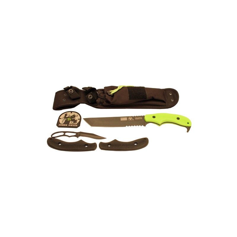 Knife comes mounted with toxic green handles. Extra set of black scales and "Acheron" skeleton knife included. Zombie patch included (mounted on sheath.)