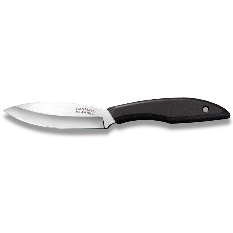 The Cold Steel Canadian Belt Knife takes inspiration from a 1950's classic. It has all the features that made the original an award-winning, international favorite. The more contemporary version is made out of German 4116 Stainless steel and hollow ground to a razor edge. It will glide through just about any material because its elliptical profile is very efficient at reducing cutting drag.