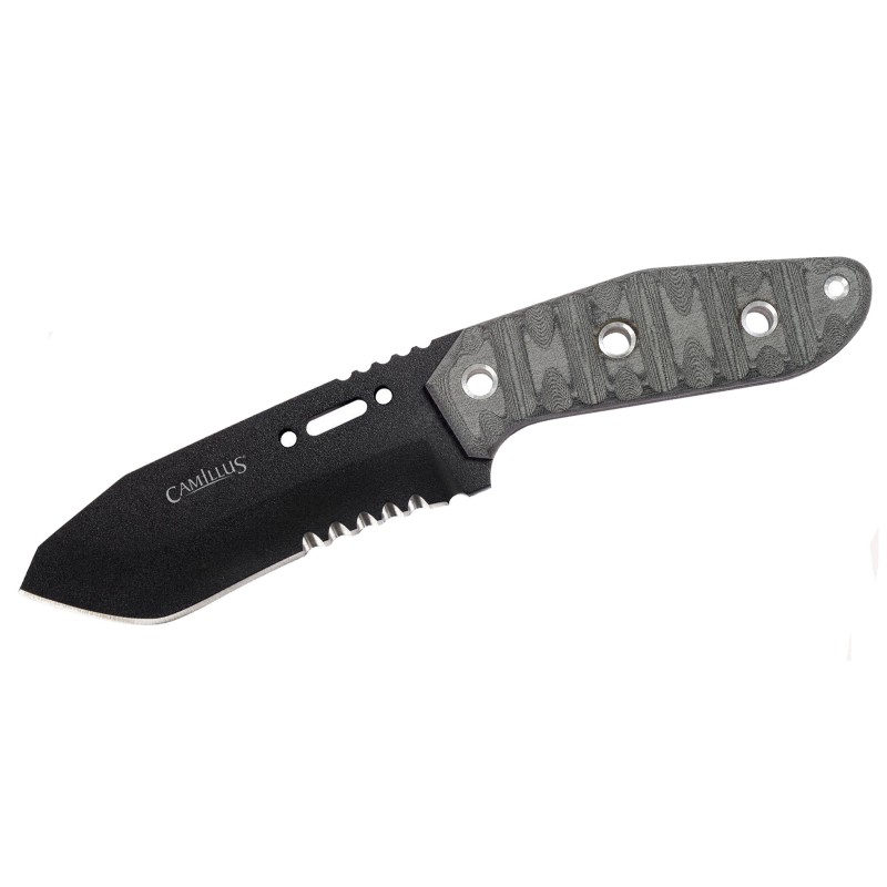 Camillus CK-9.5 produced by the high quality manufacturers at TOPS knives. 9.5" overall. 4.75" 1095 high carbon steel blade with black traction coating. Full tang. Black linen micarta handles. Black ballistic nylon sheath with black survival whistle. Comfortable to carry and will make effective tool in any situation.