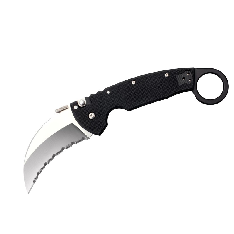 The blade was designed following Andrew Demko's extensive testing and experimentation as a Journeyman Electrician and Engineer. When making his own multi-purpose hand-made work knives he made his own Karambit / Hawkbill hybrid blade that could cut rope, cable, wire and anything else his vocation threw in his path. This knife served him well through years of hard use, and, when tasked by Cold Steel to develop his own take on a folding Karambit, this blade shape immediately came to mind.