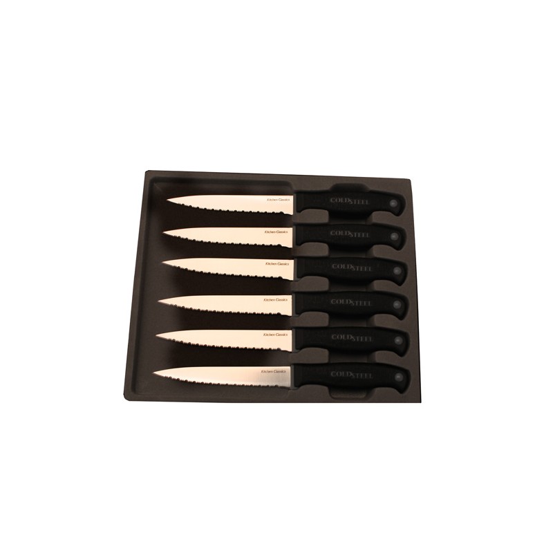 he Cold Steel Kitchen Classic knives will race through just about any task you can imagine. The blades are ice tempered and then precision flat ground for maximum cutting power. Each handle features a stiff Zy-Ex core on the inside with a softer, deeply checkered Kray-Ex exterior and is carefully designed to ensure a strong, secure, yet comfortable grip.