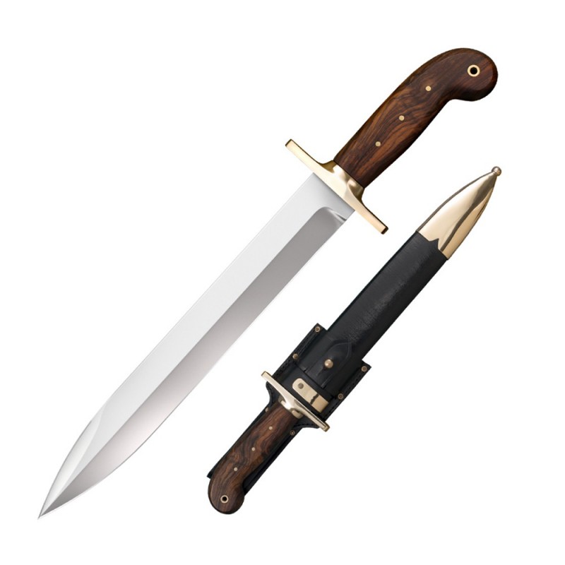 We have long admired the timeless good looks and pure functional design of the American Riflemans Knife. This rare blade was originally issued in extremely limited numbers, and has the distinction of being the first knife officially designed for, and purchased by, the U.S. Army back in 1849. Our blade takes inspiration from an antique in the private collection of our company President Lynn C Thompson, and while our blade is not an exact replica, it features many of the design nuances that make this knife such a classic! Its big, stout spear point blade is stiff enough to oppose even much larger weapons, making it an ideal complimentary knife to carry and use alongside a saber or cutlass. Plus, its beefy 12 blade and solid guard make a more than capable stand-alone blade in its own right! Its easy to see why it was chosen as a back-up blade for our nations riflemen. The Cold Steel 1849 Riflemans Knife is hand forged from 1085 High Carbon steel, with a solid brass guard and beautiful Rosewood handle scales that encapsulate the sturdy full tang. The Riflemans Knife is sold complete with a high quality hand-stitched leather sheath and belt frog, with polished brass throat and chape. Perfect for re-enactors and collectors alike. Add one to your collection today!