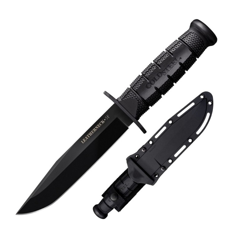 The Leatherneck-SF (for Semper-Fi) has a beautiful hand honed saber ground clip point blade. Made from tough D2 Tool Steel with a non-reflective black powder coat finish. To keep the users fingers from sliding forward onto their keen edge, the Leathernecks come with a solid steel double quillon guard.