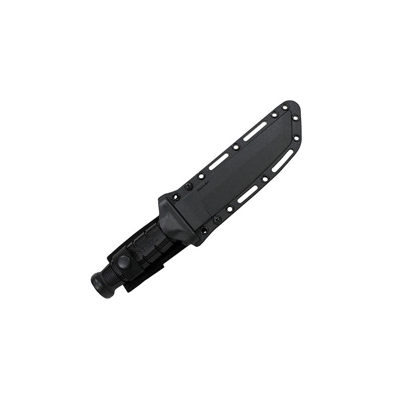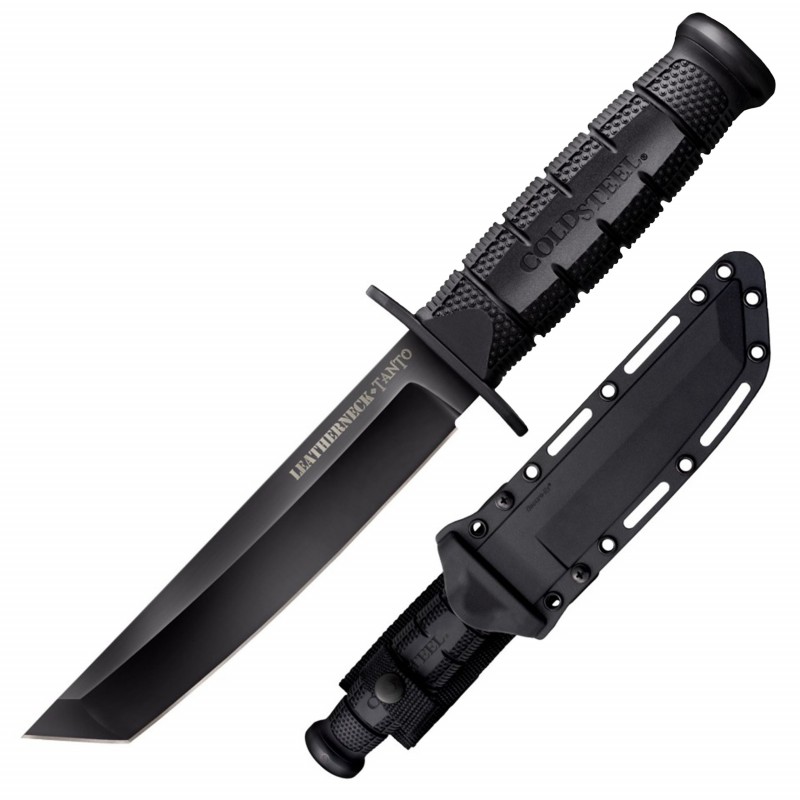 The Leatherneck Tanto features our signature Cold Steel American Tanto blade with a stout reinforced tip for extra strength. Made from tough D2 Tool Steel with a non-reflective black powder coat finish. To keep the users fingers from sliding forward onto their keen edge, the Leathernecks come with a solid steel double quillon guard.