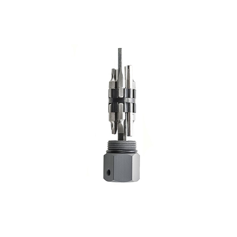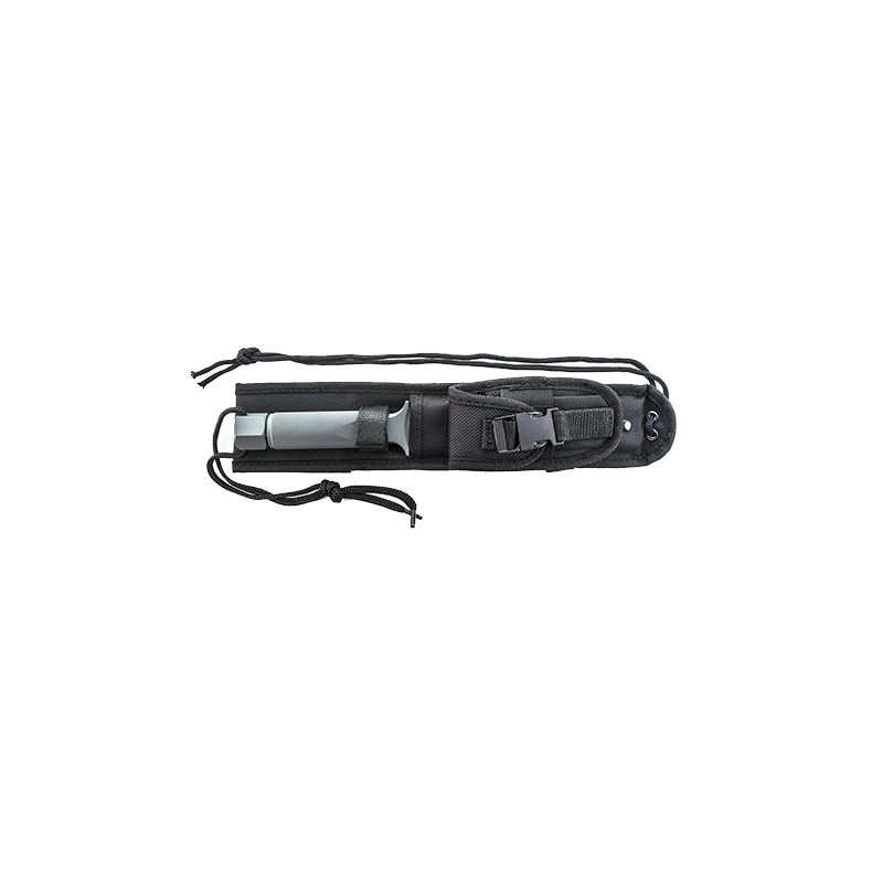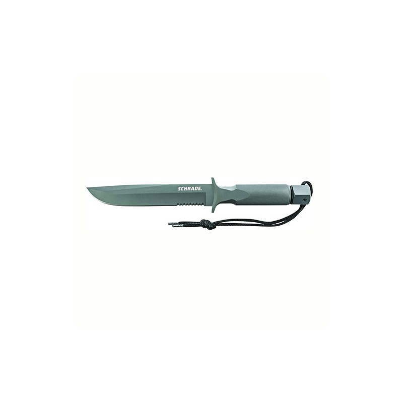 The Schrade Extreme Survival Special Forces knife is 12.7" overall, made from one solid piece of SAE-1070 high carbon steel with a dark gray finish. Originally pioneered by Chris Reeve, the one-piece knife design pairs strength and durability throughout the entire length of the knife with a hollow handle for small item storage. It's perfect for a fire starter, sharpener, or small survival kit but it comes from Schrade with a bit driver with six assorted screwdriver bits. The knife comes complete with a black nylon belt sheath and leg tie.