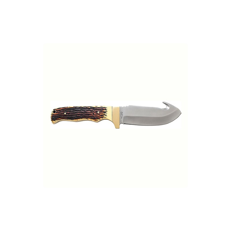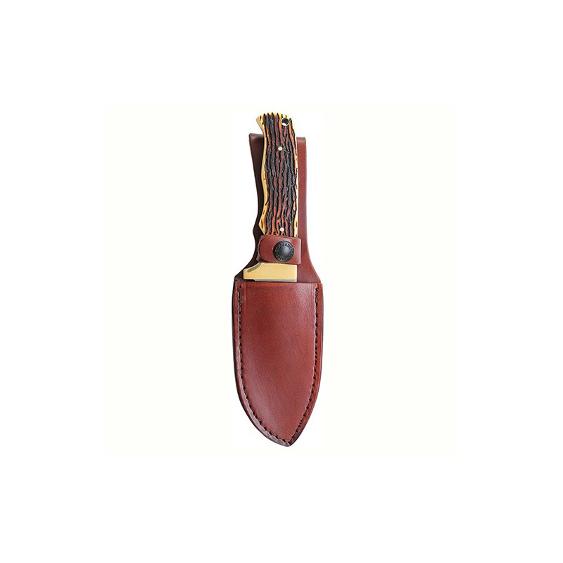 A classic knife look combined with high quality materials and makes this fixed blade knife from Uncle Henry an excellent choice for your next hunt. This knife features a large 4.25" skinning blade with a built in gut hook. The handle is made from Staglon faux-stag slabs while the blade is made from 7Cr17MoV stainless steel and extends the full length of the handle making this full tang knife both impressive to use and show off. Each knife comes with its own premium leather belt sheath.