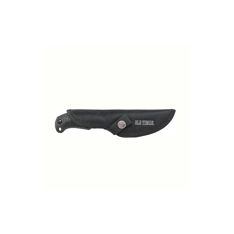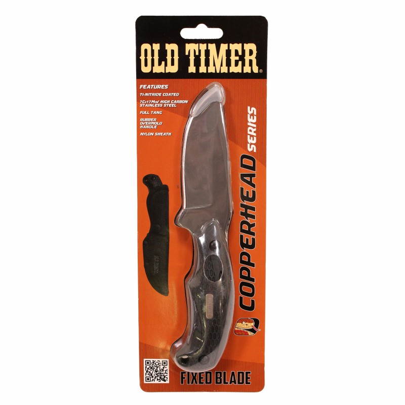 The Schrade Old Timer Copperhead Drop Point Fixed Blade features a full tang 3.71" Titanium-Nitride coated blade made from 7Cr17MoV high carbon stainless steel. The handles are snake skin textured rubber with a jimped thumb ramp, finger guard, and lanyard hole. Comes with a black nylon belt sheath.