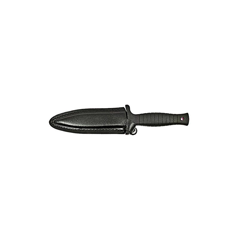 The SWHRT9BF Boot knife fixed blade is part of Smith and Wesson's Hostage Rescue Team line. The HRT 9 is a great boot knife that features a black powder coated stainless steel dagger blade with a sharpened edge. The handle has a ribbed rubber grip with an over-sized guard so you can keep your hand set in even the most demanding situations. The included leather sheath has button closure and a steel clip for carry.