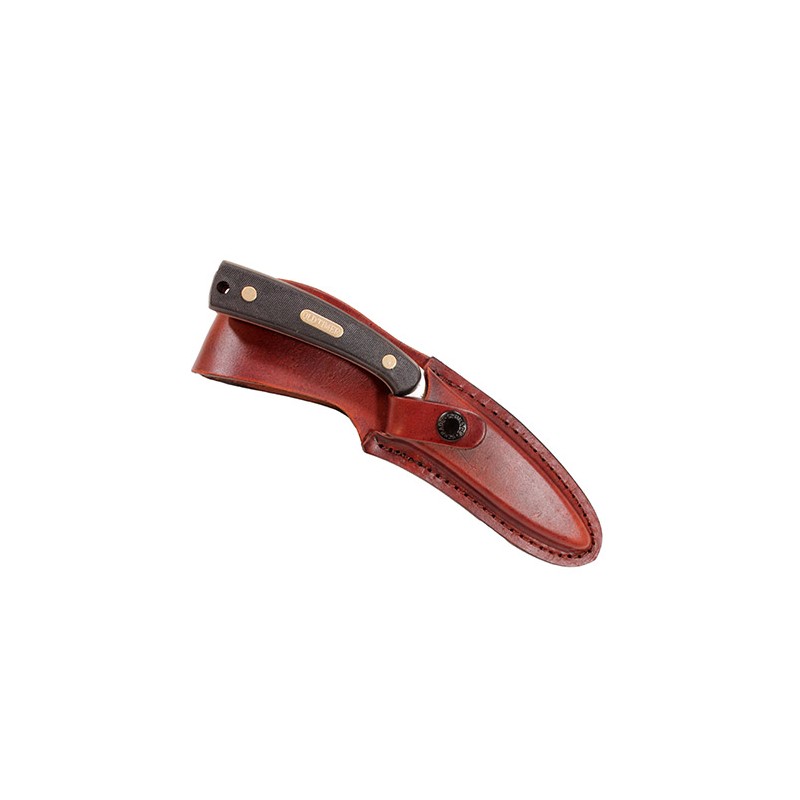 This Old Timer Guthook Skinner Knife is a great tool to take along on hunting trips. It features a stainless steel satin finish blade with gut hook and polymer composite scales over a full tang with brass rivet construction. Includes a leather sheath with 2" belt loop.