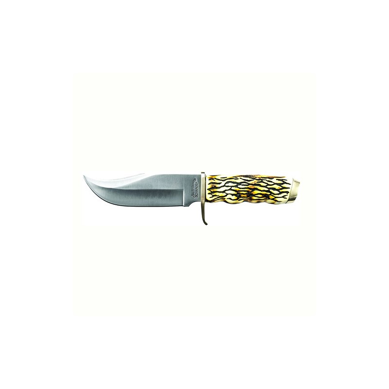 Uncle Henry's Pro Hunter Knife embodies the old traditions of the American west - durability, keen edge, and long lasting. It features a stainless steel clip point blade, Staglon handle and satin finish. The handle features polished nickle silver large guard and pommel. The Pro Hunter comes with leather sheath and sharpening stone.