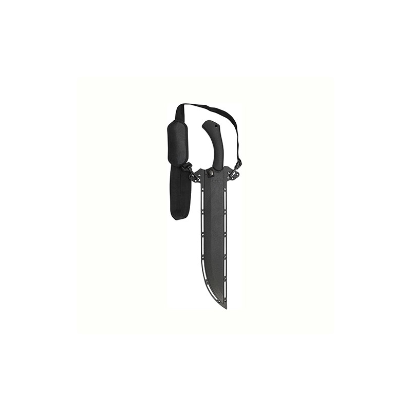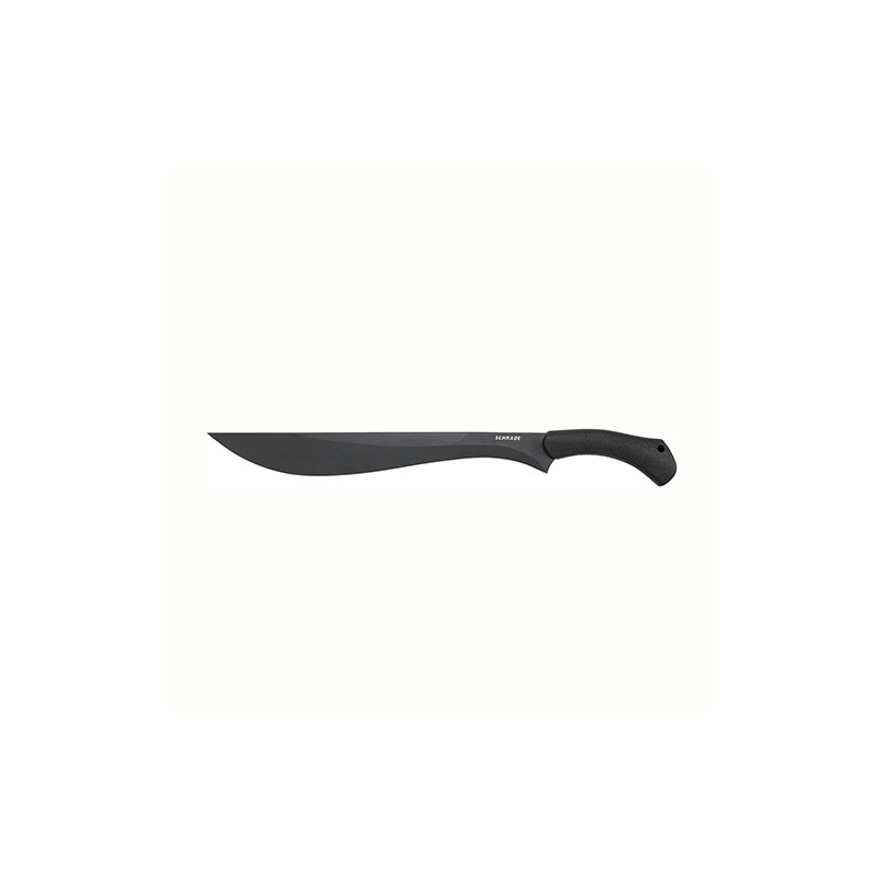 The Schrade Priscilla Makhaira Brush Sword has a 16.06" black powder coated 3Cr13 stainless steel blade which will take a very sharp edge and provides quite adequate corrosion resistance. The thermoplastic elastomer handle is a hard plastic which provides an extremely secure grip under in any weather conditions. The thermoplastic sheath it comes with is complete with a shoulder strap
