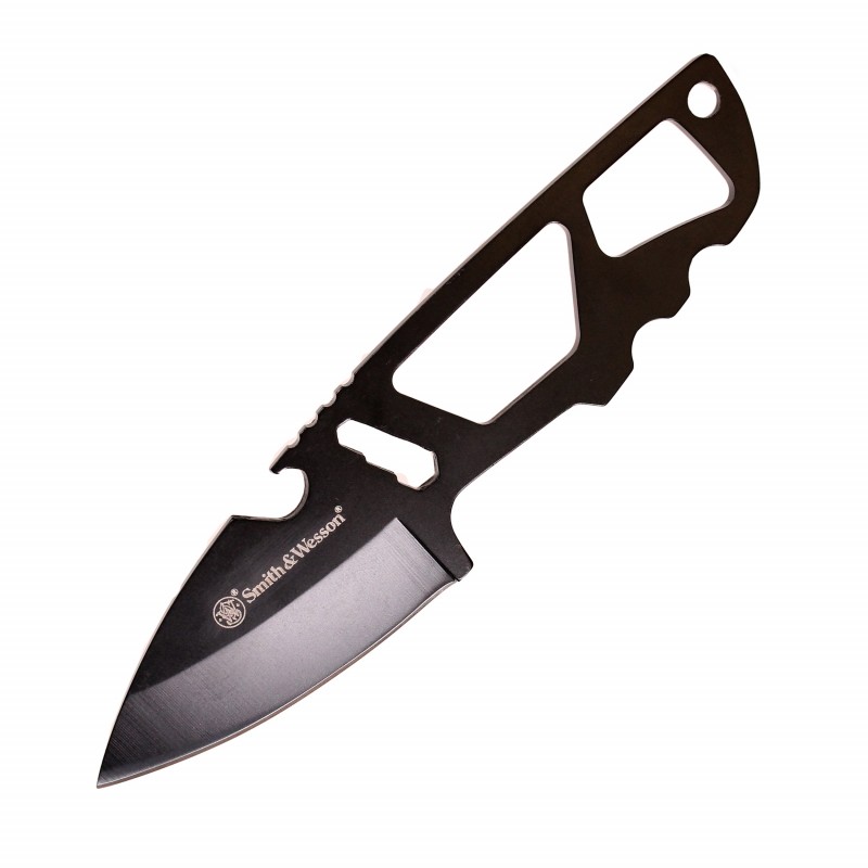 The Smith & Wesson SW991 features a compact, multi-functional design for versatile EDC use. It has a black stonewashed stainless steel blade with an integrated bottle opener, a skeletonized stainless steel handle with a built in hex wrench, and a molded sheath for comfortable everyday carry.