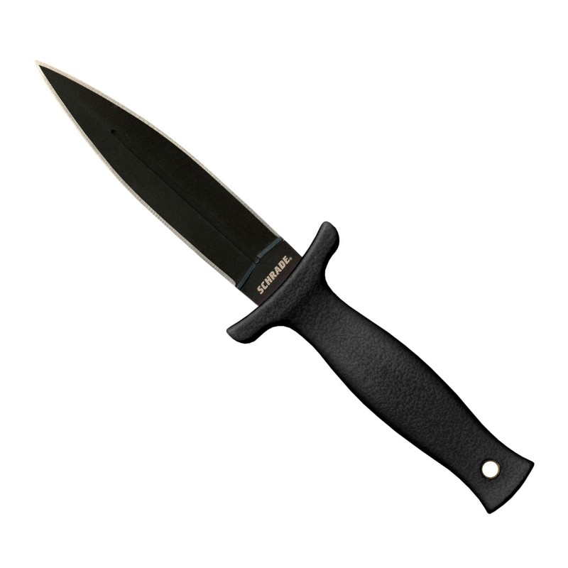 The SCHF19L Boot Knife from Schrade is a compact fixed blade with a double-edged dagger. It features a black powder coated blade and textured TPE rubber handles with a double guard for safe use. The SCHF19L includes a leather sheath with boot/belt clip.
