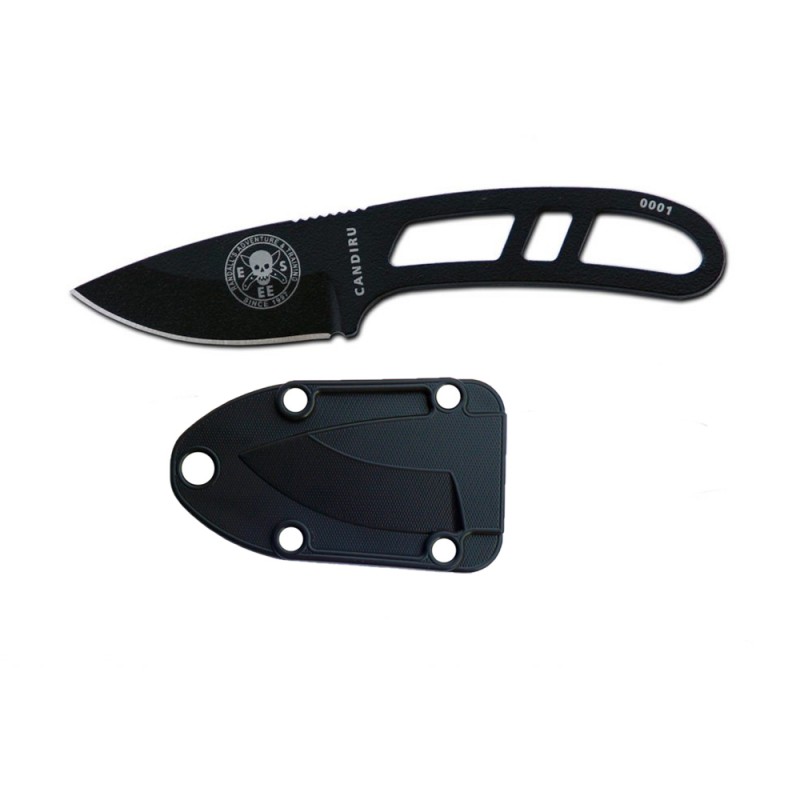 The Candiru is the most compact knife that ESEE offers yet it is still a ferocious cutter. It, like the Izula, is designed for neck carry or to be a secondary backup knife should the need arise. These knives are made from high carbon 1095 steel. And while 1095 is a top choice for professional cutlery designed for hard use, it will rust and stain if not properly cared for - especially on the cutting edge and around the laser engraving. It is the user's responsibility to keep the blades properly lubricated and cleaned.