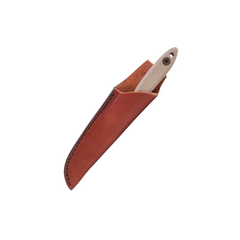 The Camp-Lore series of knives from ESEE are designed by some of the most experienced woodsmen in the world and made by Rowen in Idaho, USA. The CR2.5, designed by Cody Rowen, has a stonewashed 1095 steel flat ground blade with a tan Micarta handle. This is the smallest knife in the Camp-lore series and it features a smooth rounded handle. It is supplied with a leather sheath with belt loop.