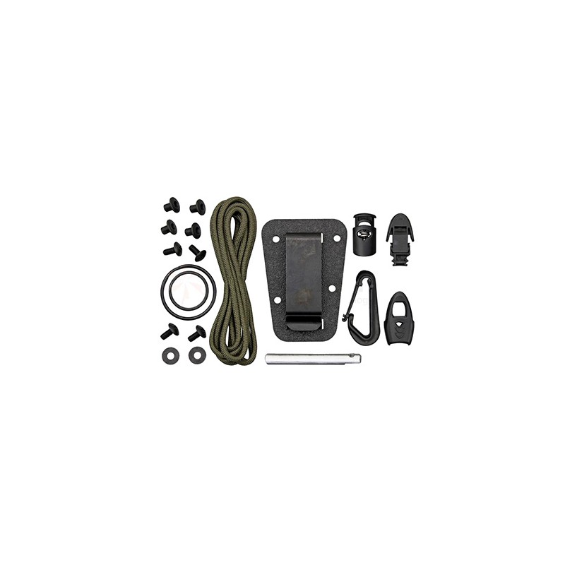 Izula Complete Survival Kit includes paracord, cord lock, large split ring, small split ring, ferro fire starting rod, emergency whistle, and plastic snap hook.