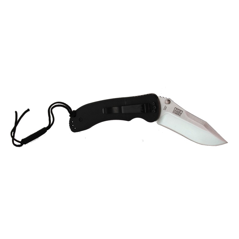 This is one of the knives from Ontario Knife's second series of Joe Pardue Utiliac knives. This series features AUS-8A steel blades at 0.115" thickness that are flat ground at 40 degrees. These knives have ergonomic styled Zytel handles. Situated in New York State's scenic Southern Tier, Ontario Knife Company produces one of the most comprehensive, wide-ranging product lines in the cutlery industry today. While being a worldwide supplier, the Ontario Knife Company is also a major supplier to the U.S. Government and its military. Ontario has built its reputation on a heritage of uncompromising craftsmanship, quality materials and components, and a steadfast commitment to its workforce. Liner Lock locking mechanism. Thumbstud for easy one-handed opening. Matte satin finished drop point blade style with rounded Zytel handle. Blade has a hardness of 56-58 HCR. Includes four-position pocket clip.