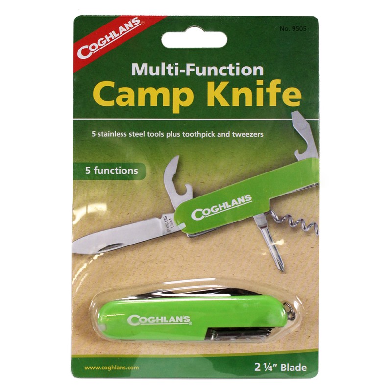 Multi-Function Camp Knife, 5 Stainless Steel Tools Plus Toothpick and Tweezers