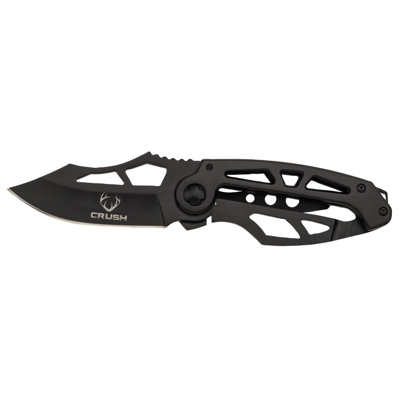 Be prepared in the field with the Kutmaster The Crush Framelock Tactical Skinner. This lightweight knife is constructed of durable 420 stainless steel for precision tactical skinning and caping blade that will stand up to wear and tear. Features include framelock construction, black plated handle and blade and a convenient pocket clip for carrying. Designed by Kutmaster and "The Crush" hosts Lee and Tiffany Lakosky. Blade length: 2.75".