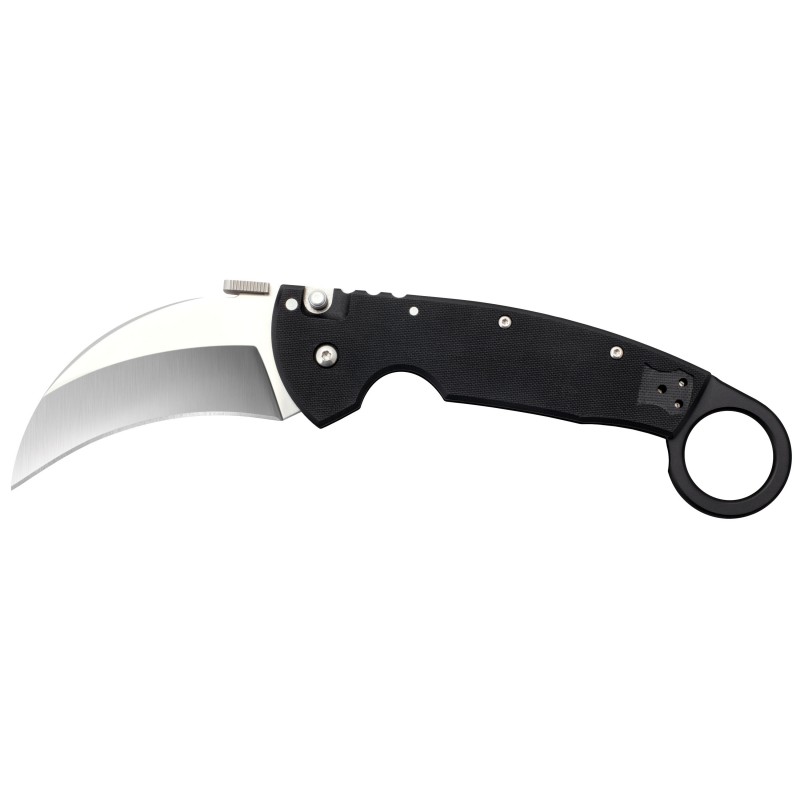 The blade was designed following Andrew Demko's extensive testing and experimentation as a Journeyman Electrician and Engineer. When making his own multi-purpose hand-made work knives he made his own Karambit / Hawkbill hybrid blade that could cut rope, cable, wire and anything else his vocation threw in his path. This knife served him well through years of hard use, and, when tasked by Cold Steel to develop his own take on a folding Karambit, this blade shape immediately came to mind.