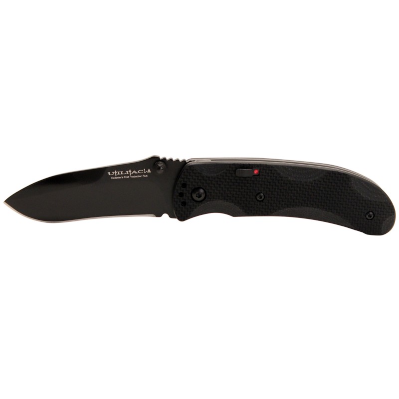 Ontario Knife Company's assisted opener is the Utilitac 1A. Based on the top selling original Utilitac folding knife designed by Joe Pardue, this knife features a three-inch AUS-8 steel blade (7.125 inches overall) with a black finish, an upgraded black G-10 handle, and Ontario Knife Company's exclusive Tactical Assisted Opening (T.A.O.) mechanism. The patent-pending T.A.O mechanism was also designed by Joe Pardue to be more efficient and durable than other AO system as it features only five moving parts the opening kick is nothing short of impressive. Precision manufactured in Taiwan.