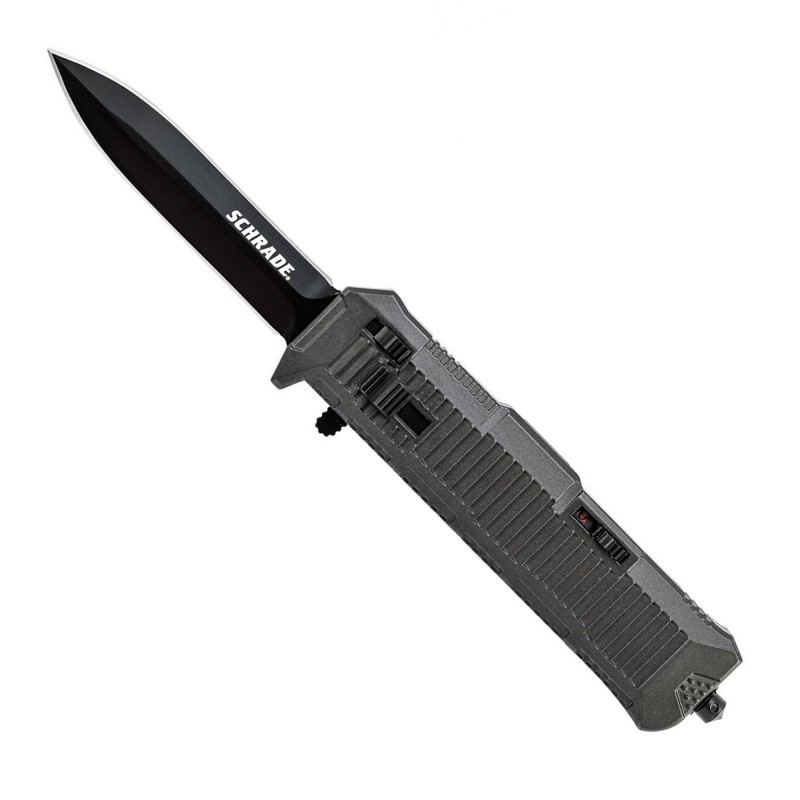 Schrade has so many models - but they are cleverly designed, well made and really economical. These Out-the-Front openers are super fast and well made. They have a safety on the side and the mechanism takes a little getting used to, but they are truly awesome and impressive. It's got a black coated 3.35" double edge spear point blade, tough aluminum handles, finger actuator, glass breaker, and a locking safety mechanism. This is a cool looking knife and one you get the hang of it, will be something you will enjoy playing with.