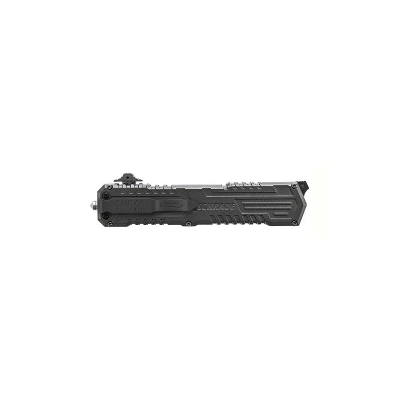 The Viper Out-the-Front Assisted Opening knife from Schrade features a double-edge blade with a black finish and a partially serrated edge. The handle is dark gray finished aluminum with a safety, pocket clip and glass breaker. To deploy the blade, simply push on the slider near the base of the handle to get the blade moving and the spring assist mechanism will take it the rest of the way. To retract the blade, release the lock and pull down on the slider to lock it back in place. It is assisted automatic deployment and manual retraction.