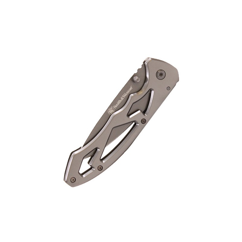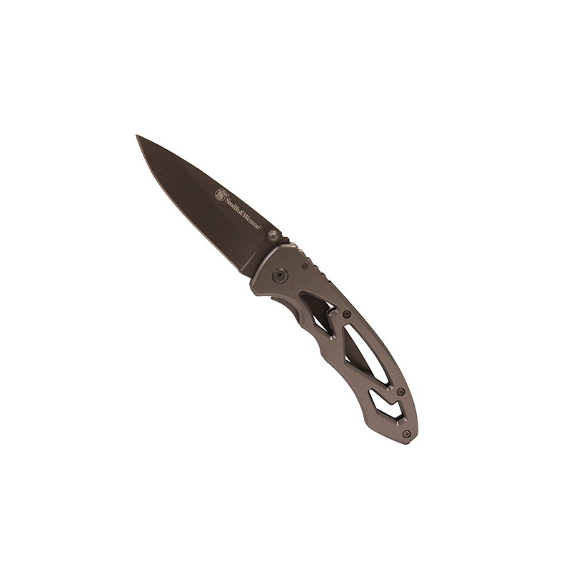 The Smith & Wesson CK400L Large Drop Point Frame Lock is just that, with a skeletonized stainless steel handle. The design has jimping on the spine of the blade, though it's not very aggressive. This is a great secondary knife to carry to use and abuse.