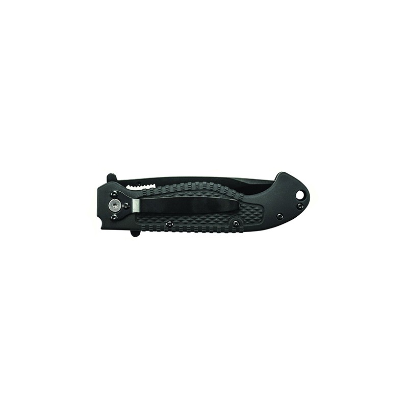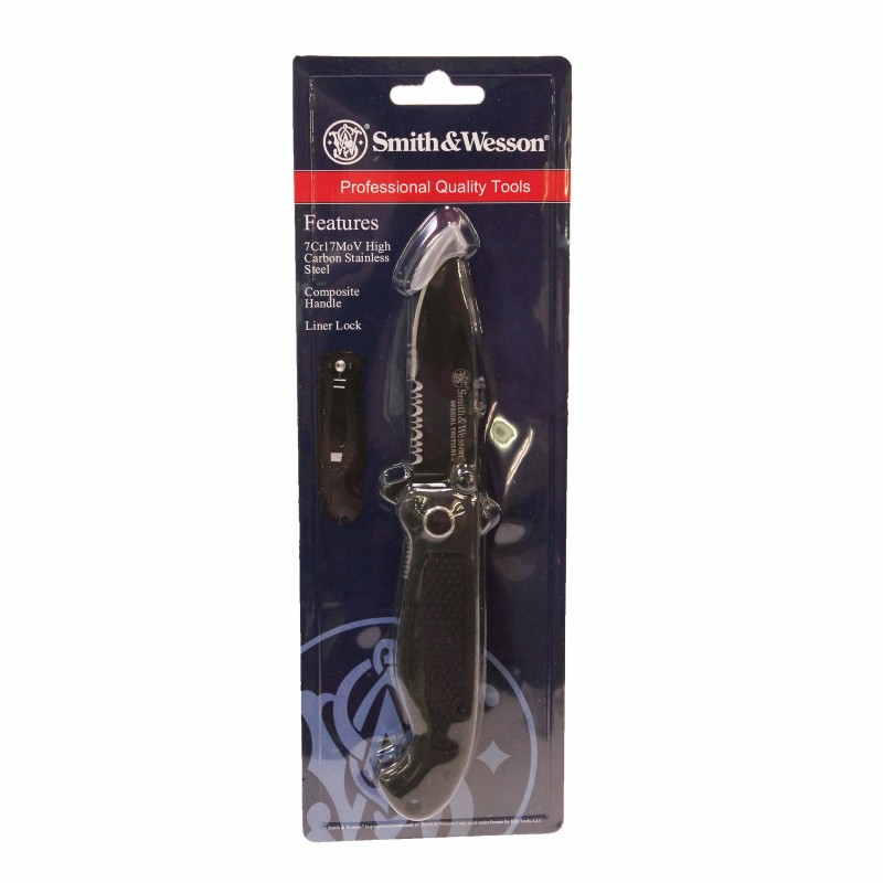 Smith & Wesson Special Tactical Folder knife, model CKTACBSD, boasts a combo edge drop point blade with a black tactical finish. Easy to open with the single thumb stud or the spine flipper, the blade locks open via a liner lock. The comfortable rubberized handles give loads of grip. With a tip down removable pocket clip and a lanyard hole, this knife has many carry options.
