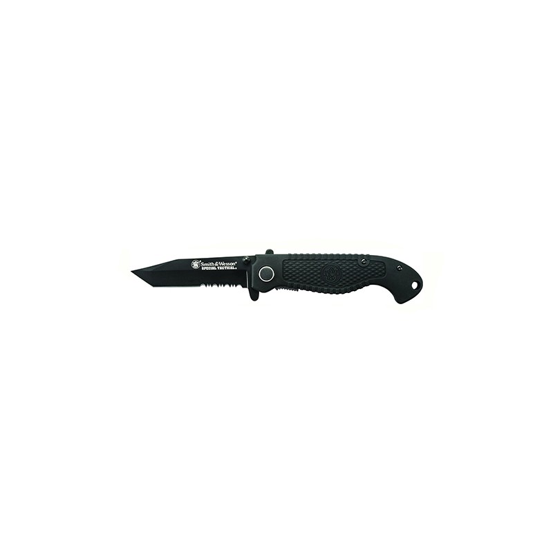 The CKTACS Special Tactical folder by Smith & Wesson features a rubber coated steel lined handle and a black 7Cr17MoV high carbon stainless steel partially serrated blade with flipper. The handle has a checkered pattern and also includes a pocket clip.