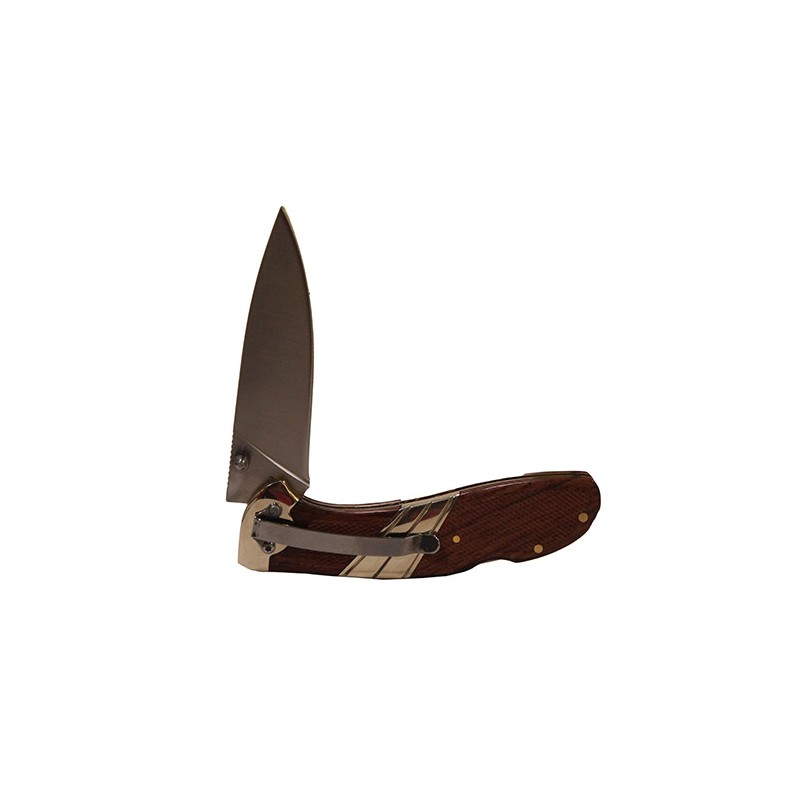 This Old Timer Large Lockback knife features textured wood handle scales and a 3.38" blade with a satin finish. The Large Lockback offers a solid EDC design built to tackle any daily cutting chore. It has a textured wood handle with brass pins and liners, and nickle silver bolsters. The blade opens with dual thumb studs and locks up solid with a lockback mechanism. Item includes a stainless steel pocket clip for comfortable everyday carry.