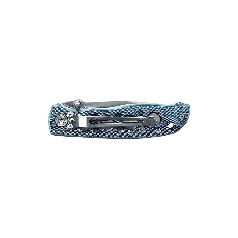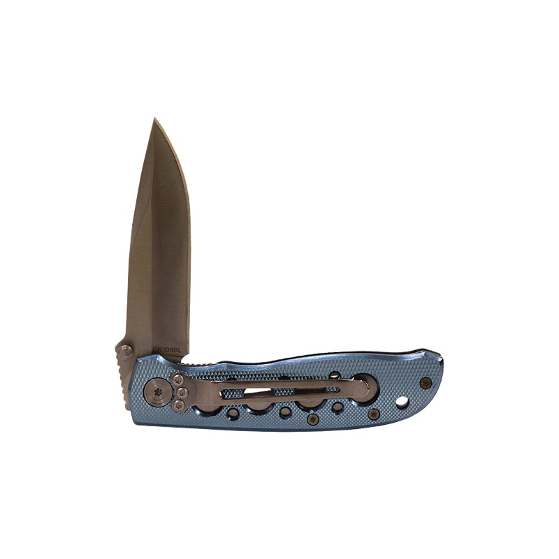 The Extreme Ops CK105BL knife handles your daily cutting chores with ease, while making you look good. A blue aluminum handle with drilled holes keeps the overall weight down and a turned diamond texture provides grip. Its satin finished modified drop point blade is quick to attention with the thumb stud opener, and a steel liner lock tab ensures solid lockup. The stainless steel pocket clip is mounted for tip-down carry.