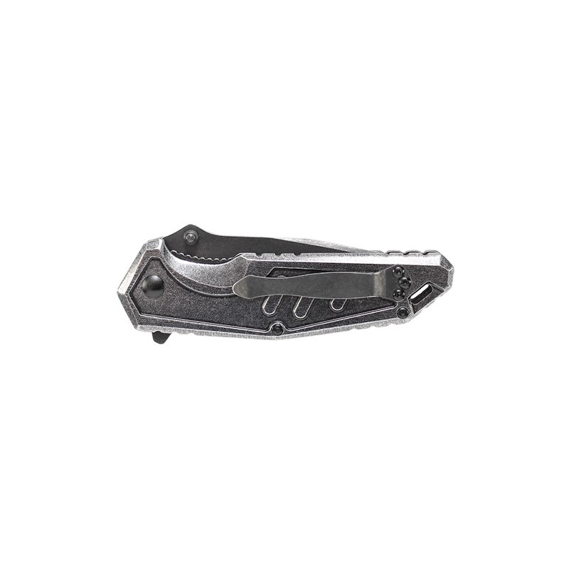 This Schrade SCH507 folding knife has a stonewashed stainless steel handle with a black insert and a black stonewashed blade. Pick up a tough EDC companion with this compact folder from Schrade knives. It offers a drop point blade with a flipper opener and a dependable liner lock. The handle comes equipped with a lanyard hole and a stainless steel pocket clip for tip-down carry.