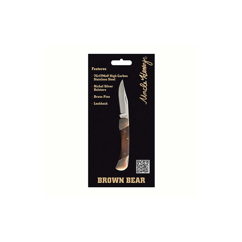 This Schrade Uncle Henry Brown Bear knife is amazing! It has a Rose Wood handle and a straight edge 400 series stainless steel folding blade!