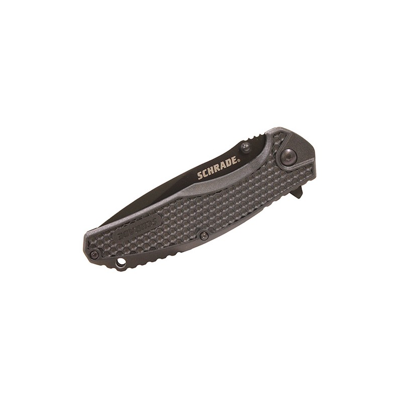 The Schrade 002 knives are tactically built utility folders with both style and function. The handle is a comfortably contoured zytel with dimpling and jimping for a secure hold in multiple grips. The thumb studs work equally as well as the flipper and the index finger choil allows for fine detail work with the 3.3" drop point blade. Form and function are achieved in unison with these knives, they're an excellent design.