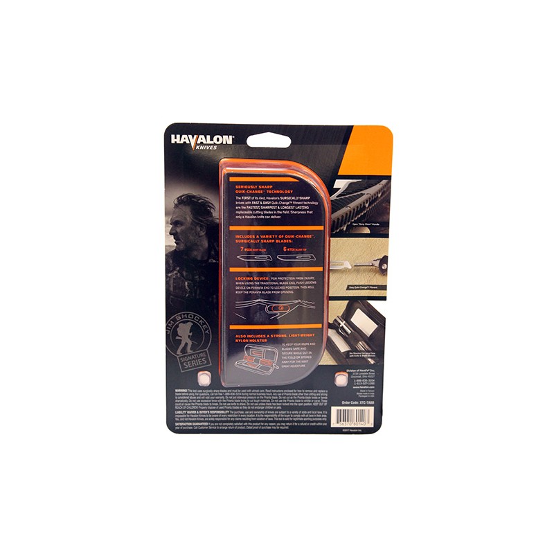 Introducing the double-folding Jim Shockey Signature Series - Havalon Titan. Featuring Havalon's revolutionary Quik-Change blade system on one end and a Cryo hardened AUS8 blade on the other. This combination gives you the unmatched sharpness of a Havalon blade and the strength of a traditional blade all in one tool.