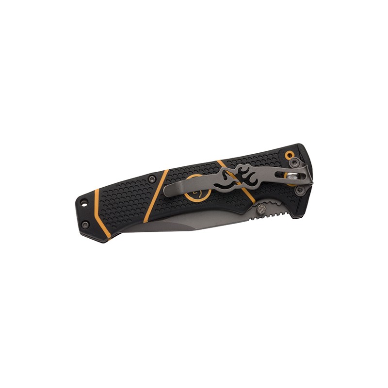 - Handle: Black Injection Molded Polymer with Contrasting Yellow Accents and Thumb Stud and Pocket Clip