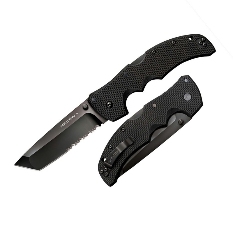 Cold Steel is famous for raising the bar in the knife industry and the Recon 1 tactical folders are setting a standard that's hard to beat. Why? Because they are as tough as nails and will cut like a chain saw! Every facet of their construction has been over engineered to make them as strong, durable and effective as humanly possible. The blades on this special run model are made from CTS-XHP stainless steel with a black DLC coating. Carpenter powdered steels like XHP offer an elevated amount of carbon that appreciably improves edge retention and strength. The handles feature G-10 laminate scales artfully contoured and scalloped for a terrific non slip grip. Plus, they are held together by the latest in high strength mechanical fasteners and further anchored by a 6061 heat-treated spacer. To compliment their super tough blades and handles they are equipped with the revolutionary Tri Ad lock, which practically precludes lock failure. To make the Recon 1 as easy to open and carry as possible, each knife is equipped with a thumb disc and small extra strong pocket clip. This clip is completely ambidextrous so lefties please take note. What's more its small size doesn't abrade or irritate the palm under protracted use.