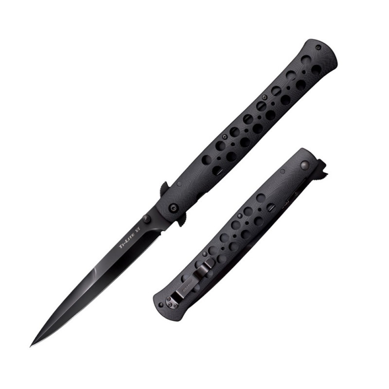 Ti-Lite tactical folders evoke the sleek speed and rebellious lines of the classic 1950's-styled switchblade. Unlike most switchblades however, they are legal to carry nearly everywhere. They feature American Carpenter CTS XHP Alloy blades with DLC (Diamond Like Coating), razor sharp edges and sturdy, needle sharp points. The handles are made of high quality G-10. And for maximum strength and safety, Cold Steel has equipped the Ti-Lites with a patent pending, stainless steel leaf spring locks (proven, in tests, to hold 130 lbs). For ease of carry, the Ti-Lites come equipped with a small, but unobtrusive steel pocket clip, and can be opened rapidly by using the thumb studs or by snagging a quillon on the edge of your pocket as you draw your knife out. Cold Steel is grateful to custom knife maker, Phil Boguszewski, for his design influence and help in the creation of the Ti-Lites.