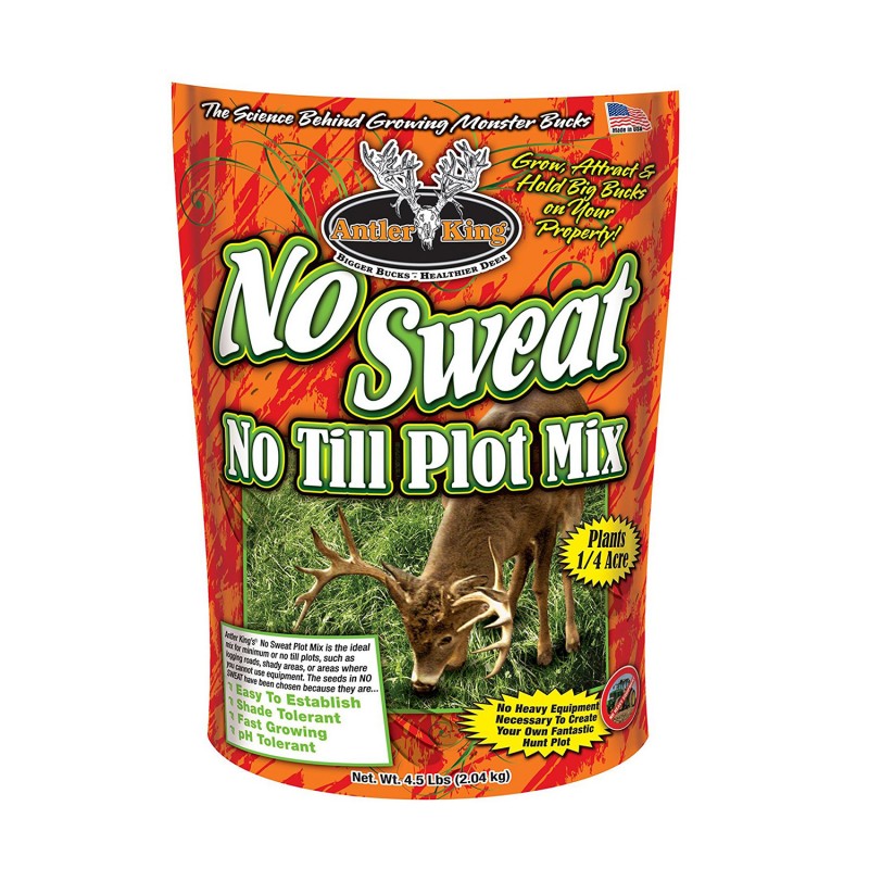 Antler King's No Sweat No Till Plot Mix is an excellent mix for minimum or no till plots such as logging roads, shady areas or where you cannot use equipment. No Sweat contains the ideal mix of perennial and annual seeds, which have been chosen because they are shade tolerant, pH tolerant, easy to establish, fast growing and deer love them.