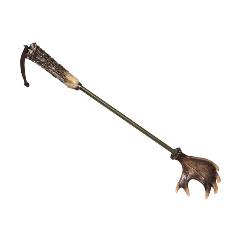 Heavy duty, 20in long, features steel shaft with rusted looking finish. Realistic hand painted resin antler handle and scratcher. Leather handle strap, moose "print" on end of handle, and Moose scene on side of handle adds a nice detail touches.